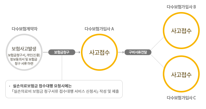 2009년 10월 1일 이후, 다수의 회사에 수익자가 동일한 실비의료비 보험에 신규 가입한 경우, 보험금 전부 또는 일부의 지급을 다수계약이 체결되어 있는 회사 중 한 회사에 청구하여 보험금을 지급받을 수 있는 서비스입니다.